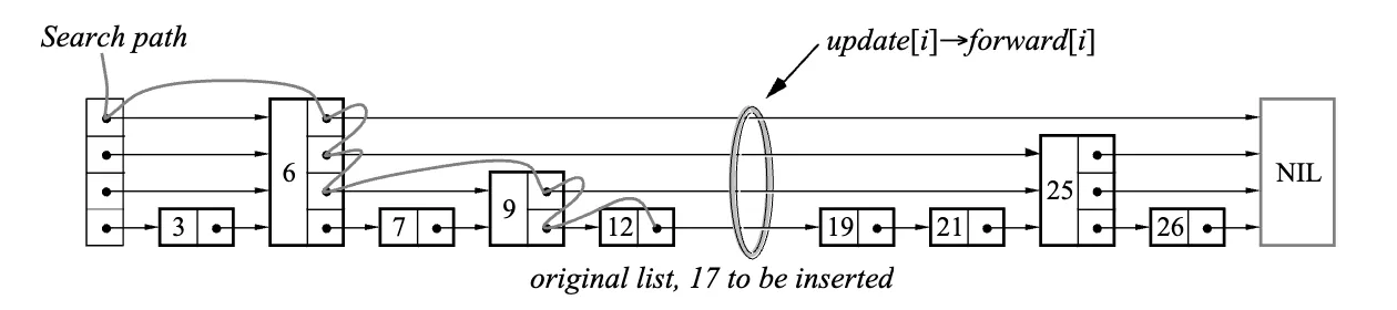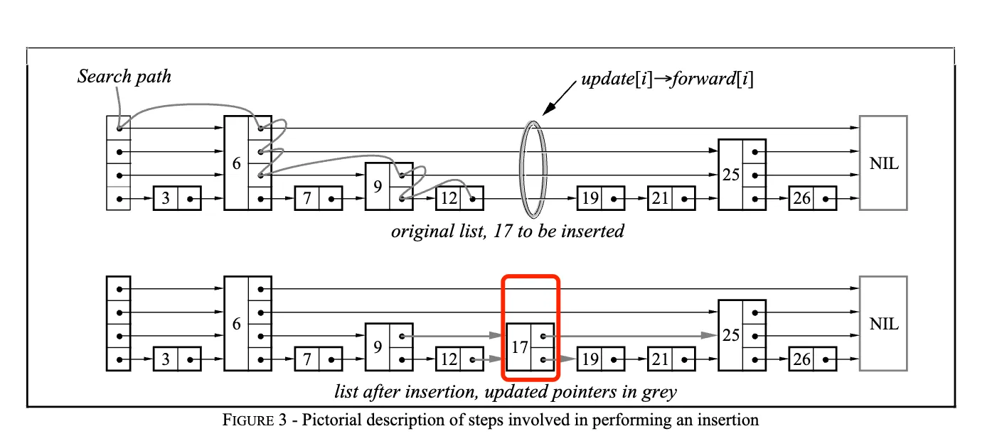 插入节点相对复杂些,在看代码之前,还是来看论文中给出的图。上半部分是查找要插入位置的逻辑,下面是插入节点后的跳表。这里看到增加了一个新的节点,然后更新了指向新节点的指针,以及新节点指向后面节点的指针。