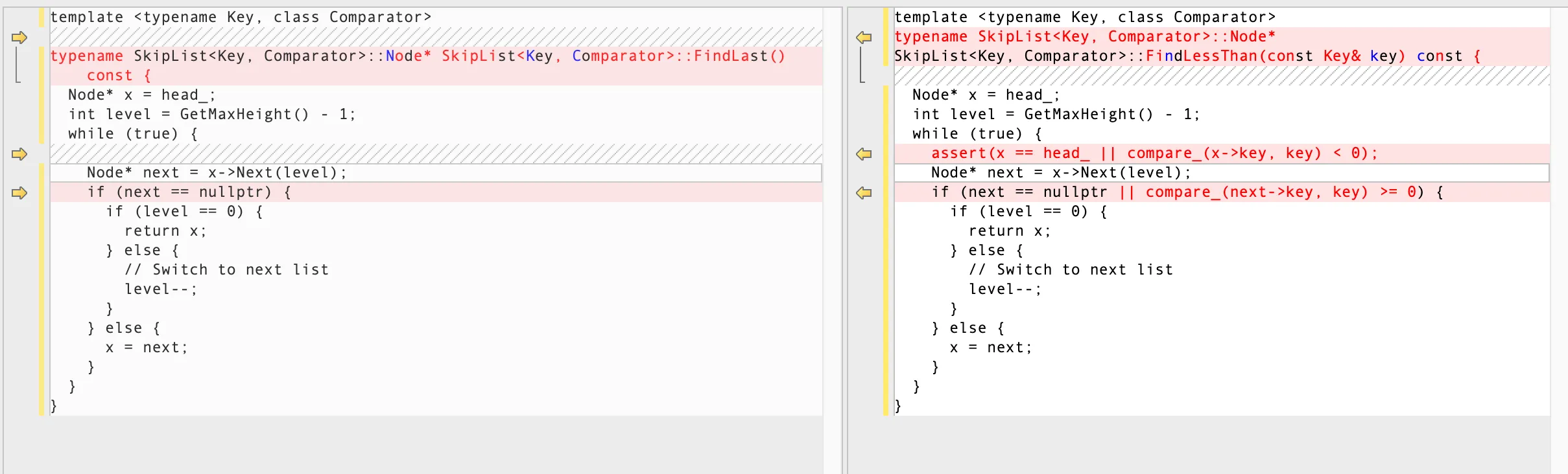 这里分别调用跳表的 FindLessThan 和 FindLast 方法,来实现 Prev 和 SeekToLast 方法。其中 FindLessThan 查找小于给定键 key 的最大节点,FindLast 查找跳表中的最后一个节点(即最大的节点)。这两个方法本身很相似,和 FindGreaterOrEqual 方法也很类似,如下图列出这两个方法的区别。
