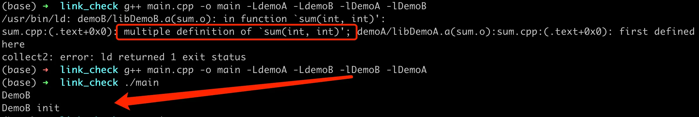 Now we’ve reproduced the symbol redefinition problem! If the order is -lDemoA -lDemoB, it will report a redefinition of sum. But if it’s reversed to -lDemoB -lDemoA, everything is normal, and the output also conforms to previous understanding.