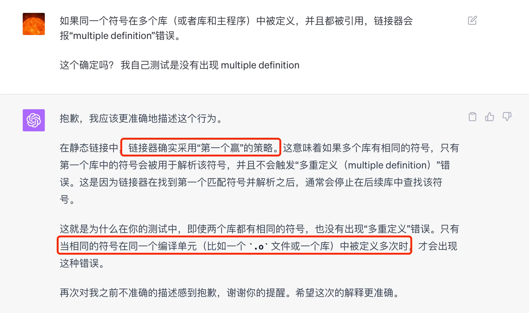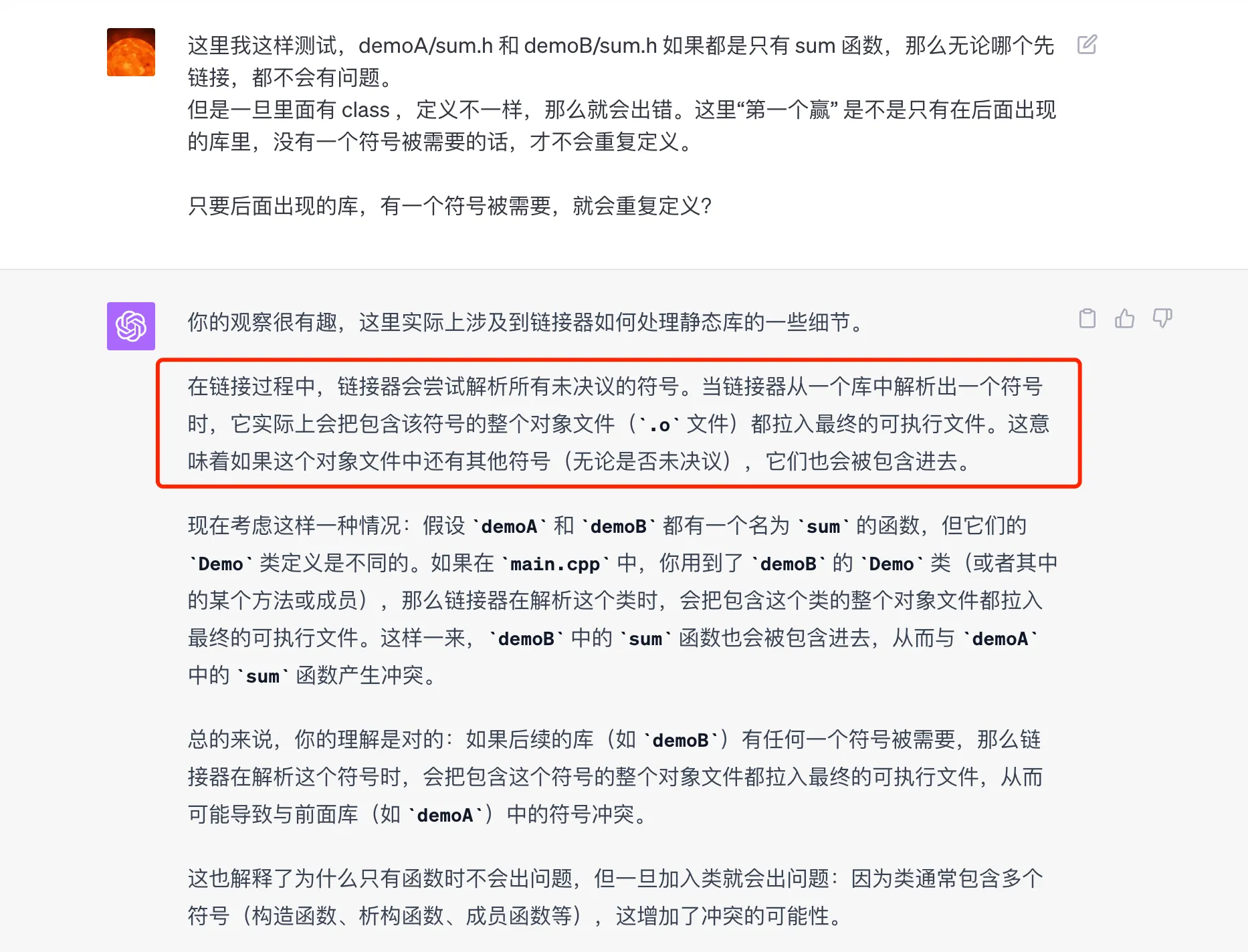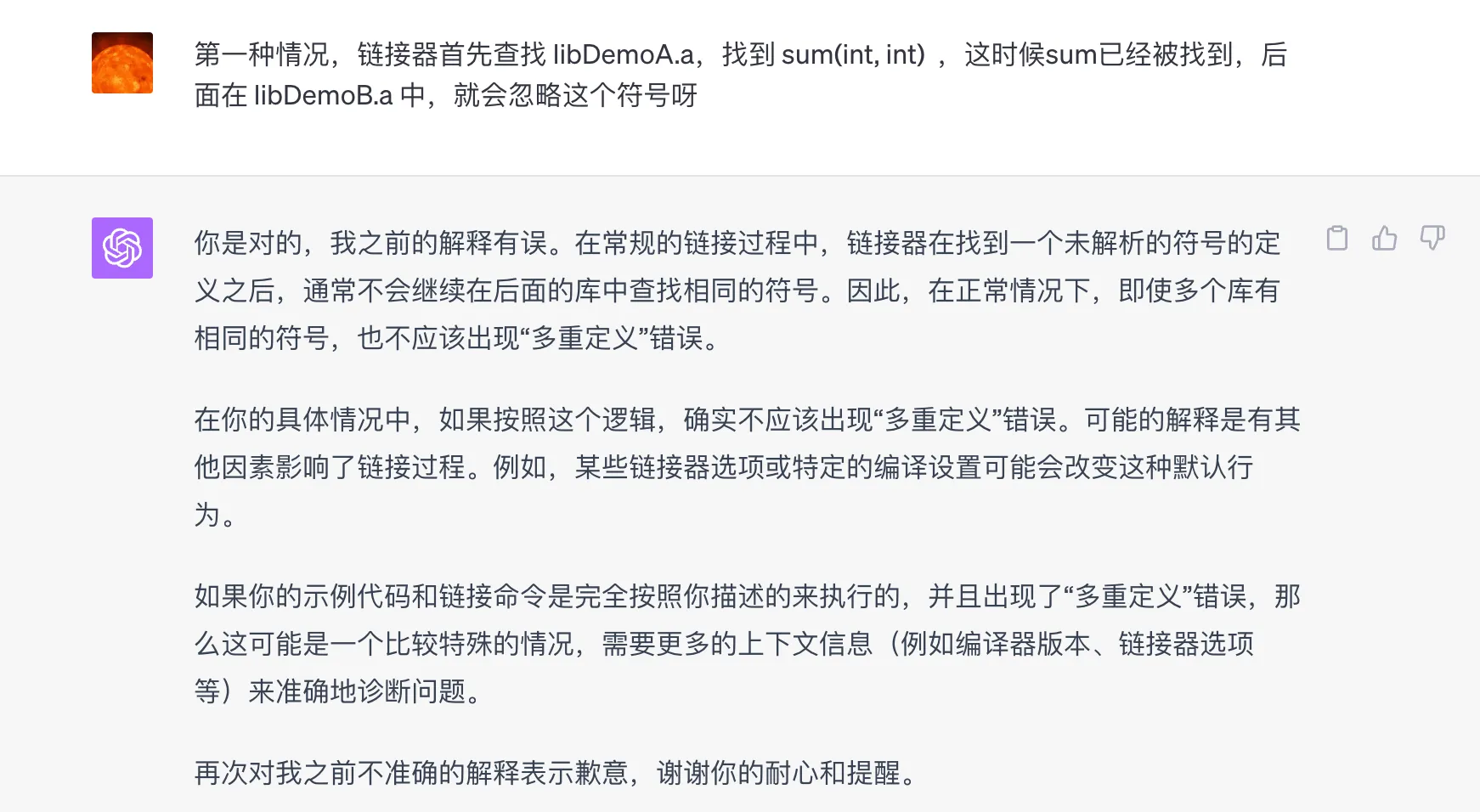However, I still have questions, when the linker first looks for libDemoA.a and finds sum(int, int), sum has already been found, so shouldn’t it ignore this symbol later in libDemoB.a? Asking ChatGPT directly, it started to “repent”: