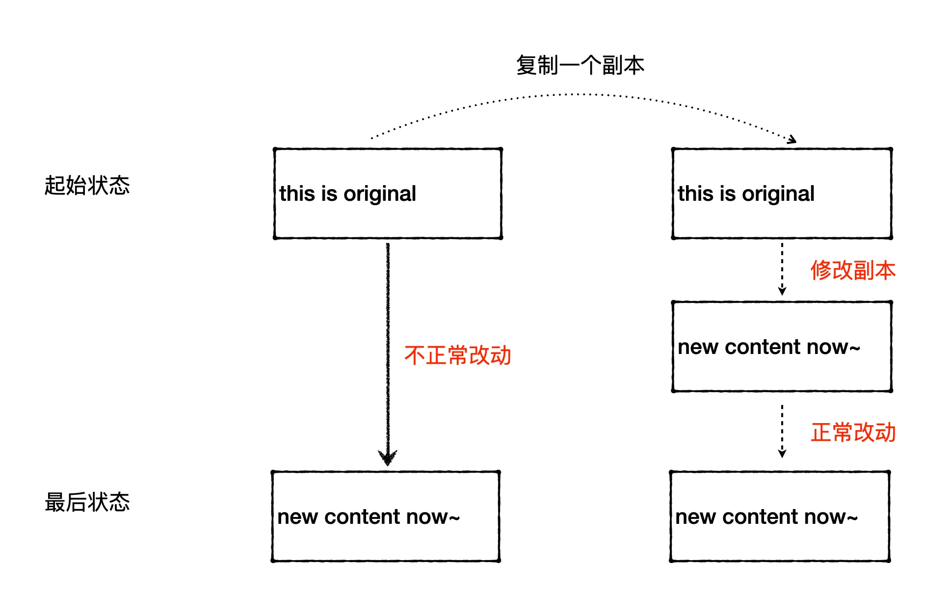 Here’s a code snippet that can consistently reproduce the issue. We define a string ‘original’, make a copy of it, and then call a function to modify the content of the copy string. The function in the business code is more complex, but for reproduction, we use a simple function that only modifies the first character of the copy. We print the contents and memory addresses of both strings before and after modifying the copy. Before looking further, you can try to guess the output of the following code.