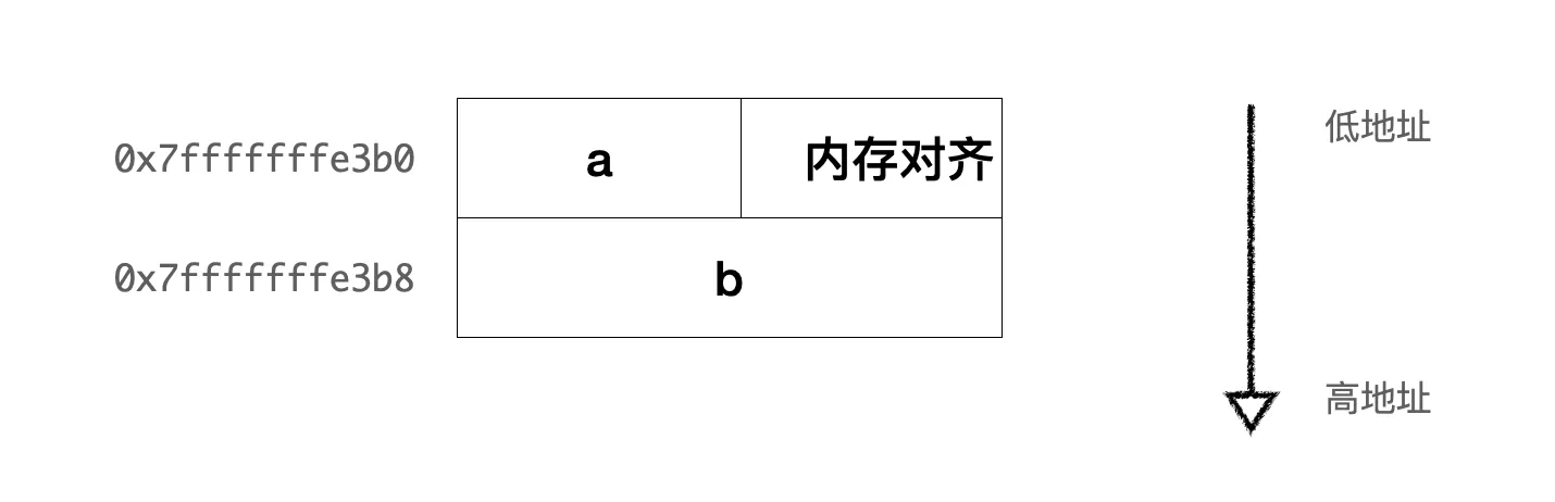 Here, the int type occupies 4 bytes on the current platform (which can be verified using sizeof(int)), while the starting address of the double member differs from the starting address of the int member by 8 bytes, indicating the presence of memory alignment padding after a (depending on the compiler’s implementation details and platform alignment requirements). Memory alignment requires that the starting address of data be on a multiple of a specific size (such as 4 or 8), which can optimize the efficiency of hardware and operating system memory access. This is because many processors access aligned memory addresses faster than non-aligned addresses.