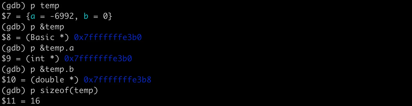The starting address of the object temp is 0x7fffffffe3b0, which is the location of the entire object in memory. The address of member variable a is also 0x7fffffffe3b0, indicating that int a is the first member in the object temp, located at the starting position of the object. The member variable b is of type double, and its address is 0x7fffffffe3b8 (a’s address + 8). The memory layout is as follows: