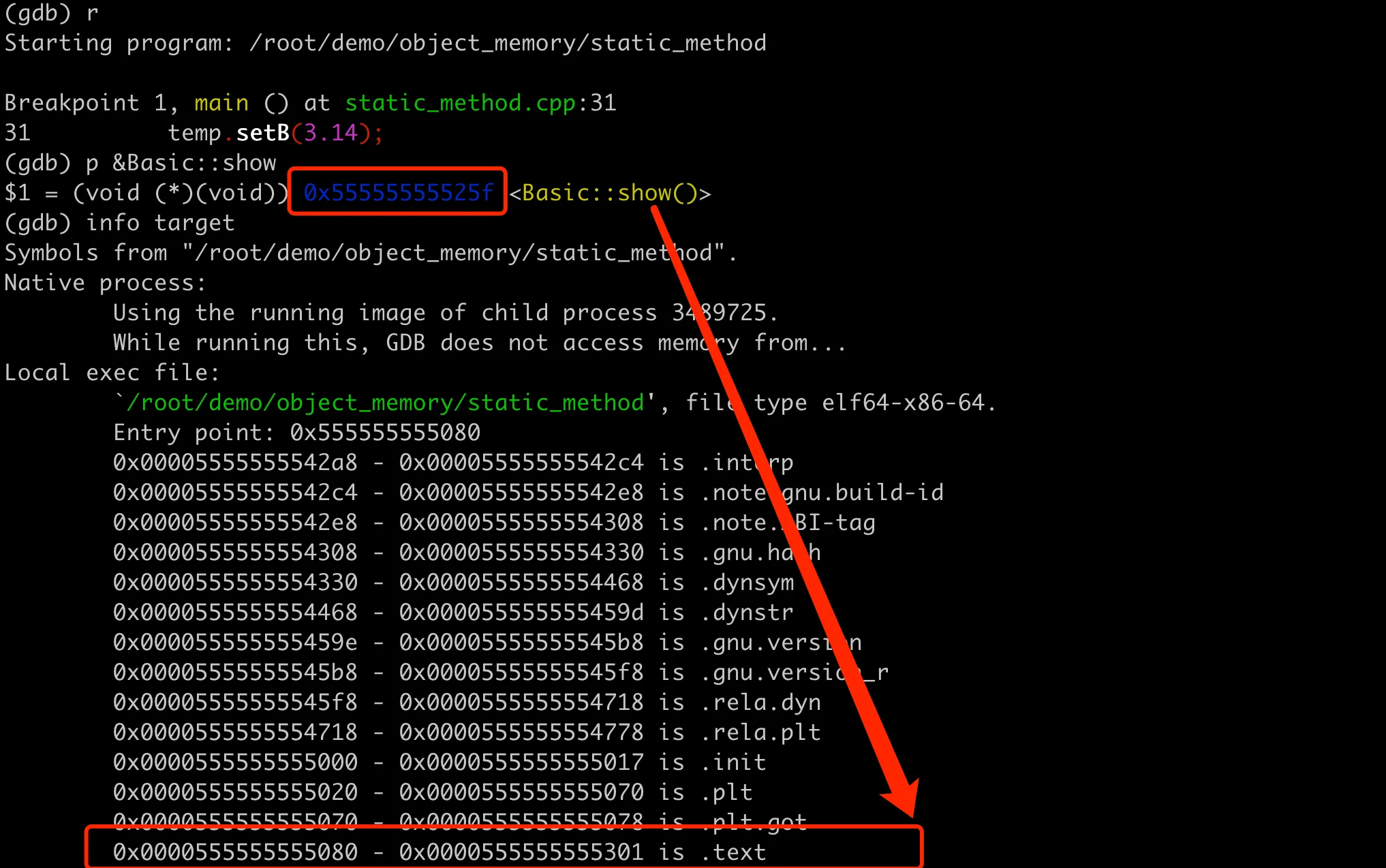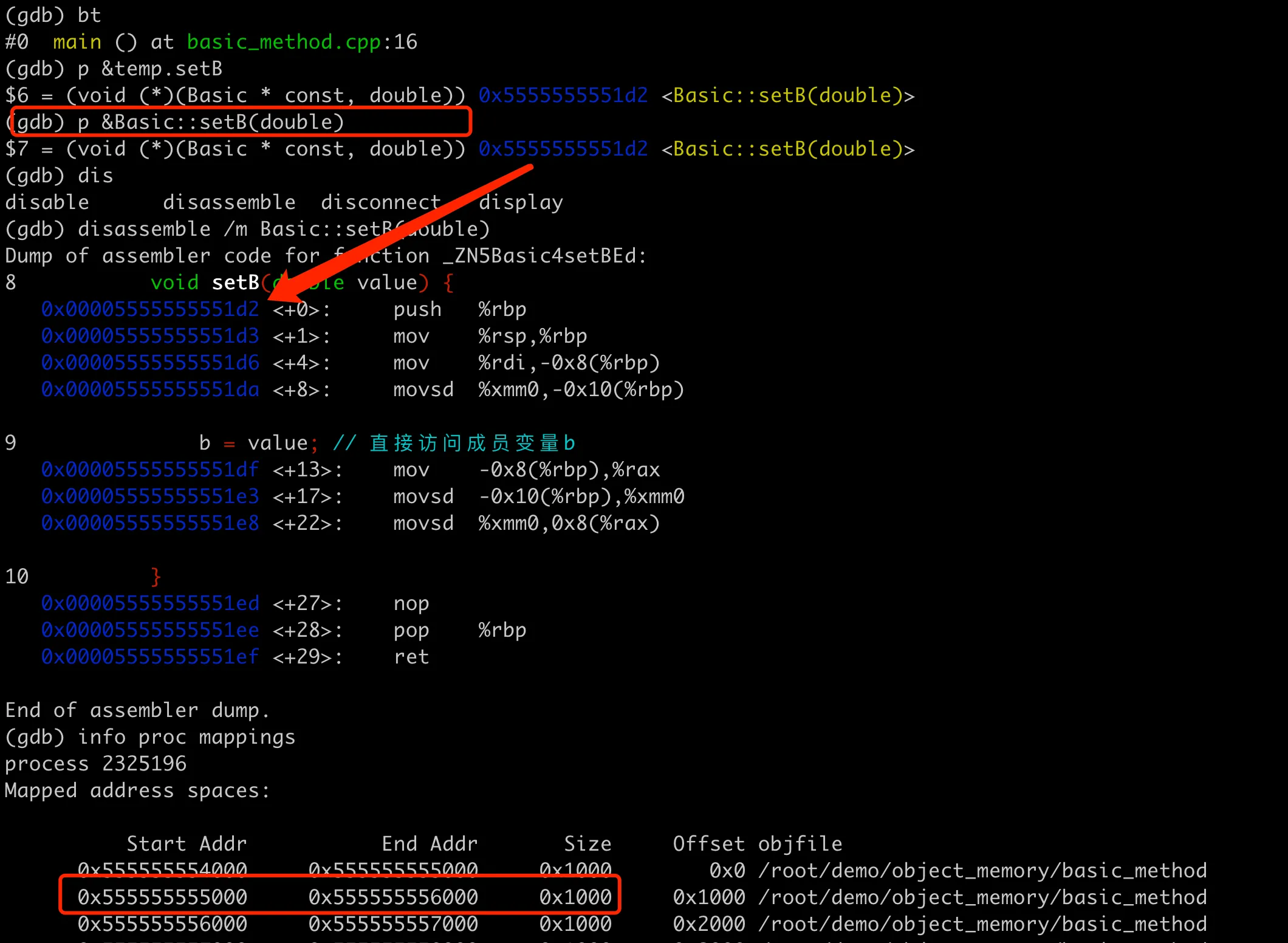 The address range of the .text segment is 0x0000555555555060 - 0x0000555555555251, and setB is just within this range. This answers the first question: member methods are stored in the process’s text segment, adding member methods does not change the memory layout size of class instance objects, and they do not occupy memory space of object instances.