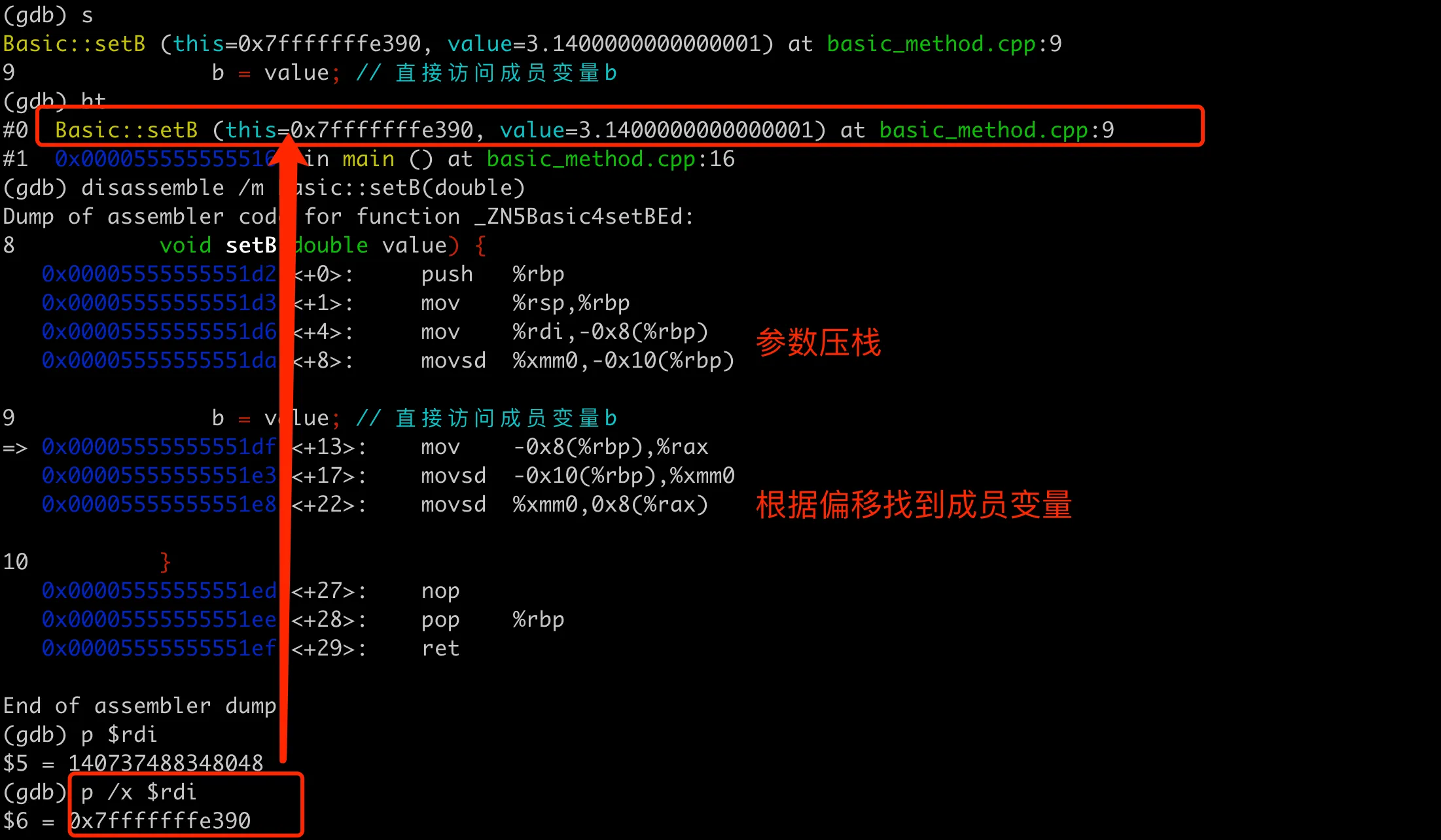 So how does the member method obtain the address of member variables? Before solving this question, let’s take a closer look at the function prototype of setB (void (*)(Basic * const, double)). Here, the first parameter of the function is a Basic* pointer, while in the code, the call is like this: temp.setB(3.14). This usage is actually syntactic sugar; the compiler automatically passes the address of the current object as the this pointer to the function when calling member functions.