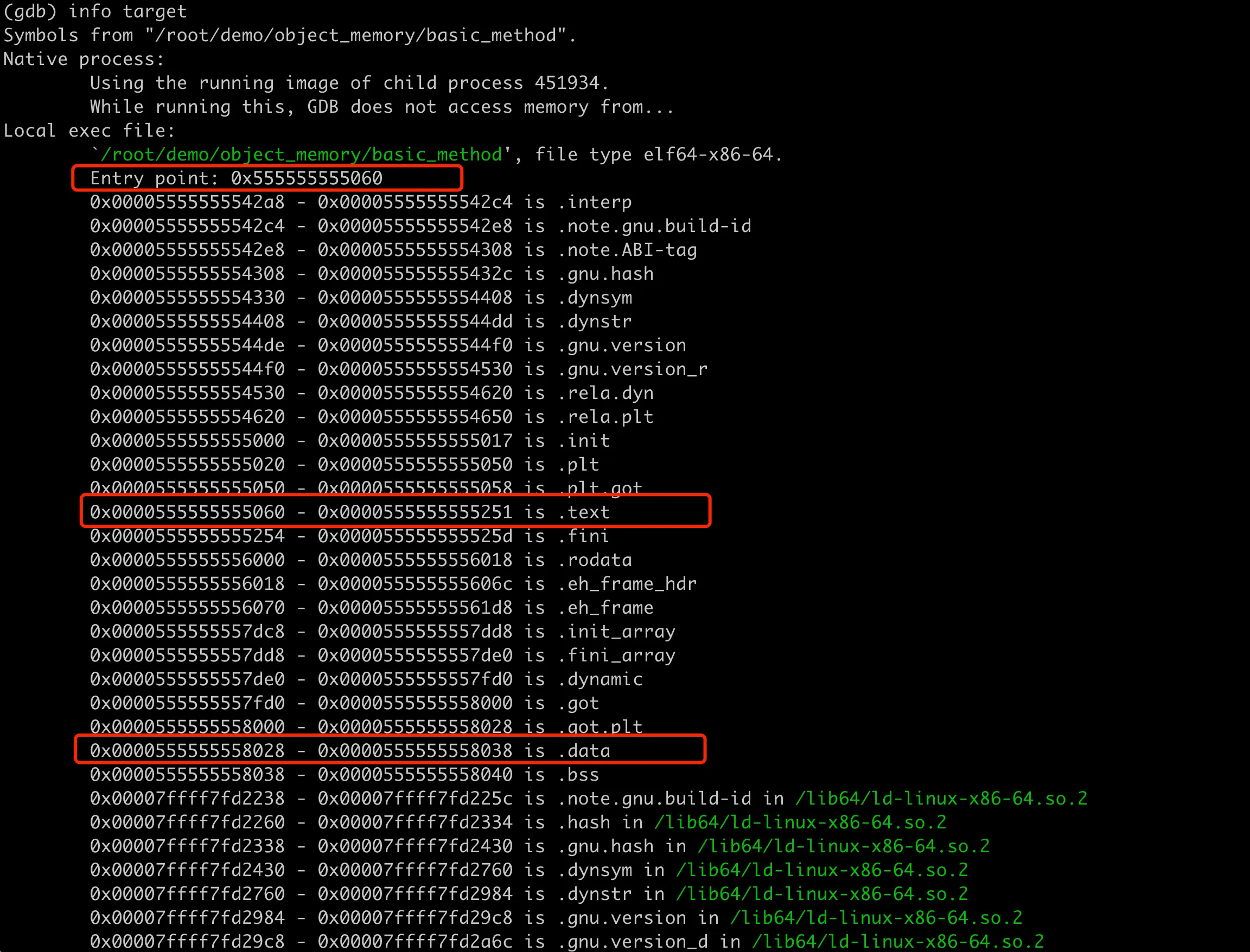 Recalling the memory layout of a process in Linux, the text segment (also called code segment) is the memory area that stores the program’s execution code, usually read-only to prevent accidental or malicious modification of its execution code during runtime. The address 0x5555555551d2 of the setB method here is located within the program’s text segment, which can be verified in GDB using info target: