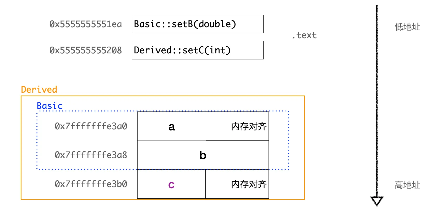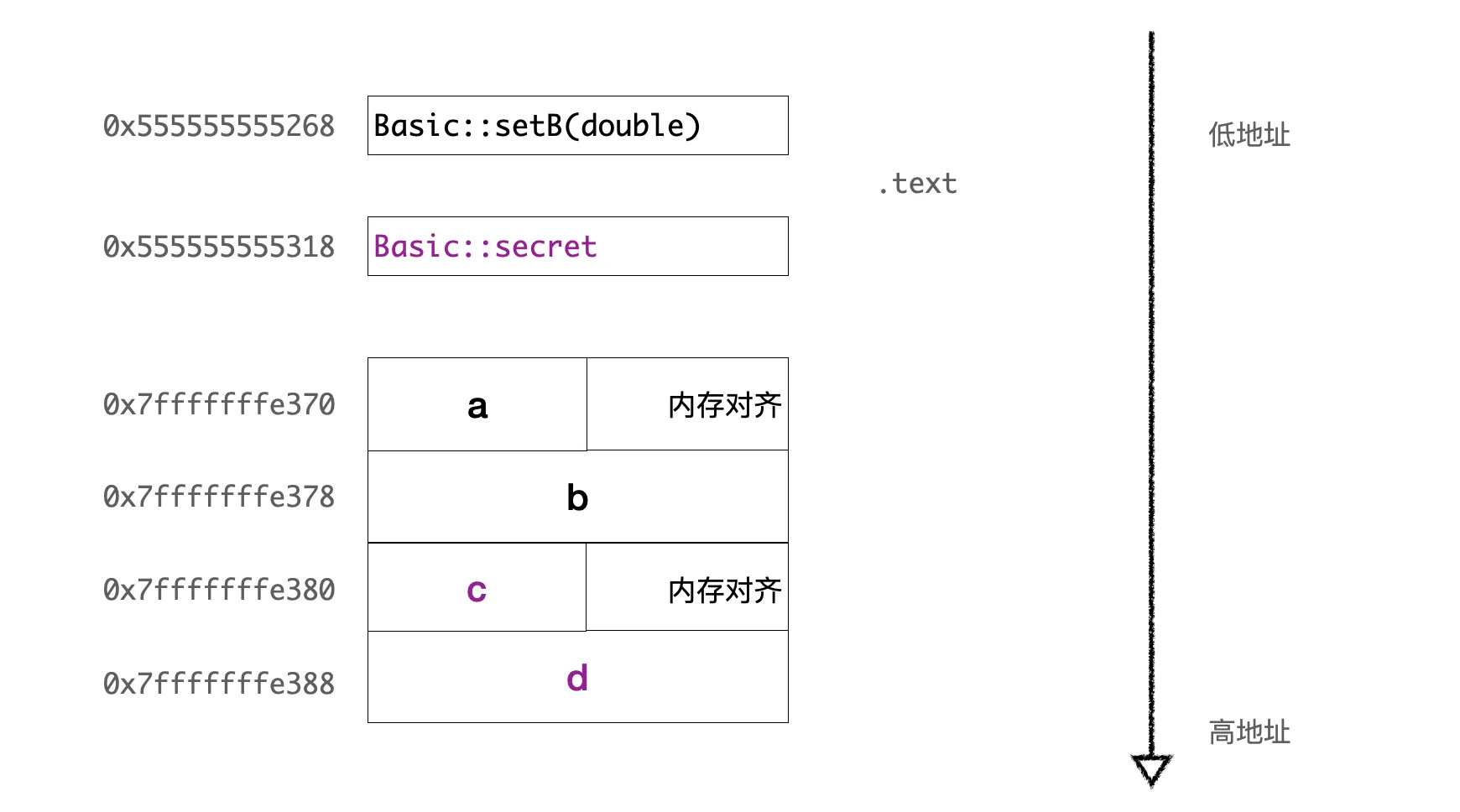 After compilation, using GDB, we can print out the addresses of all member variables and find that there’s nothing special about the memory layout of private variables; they are also stored sequentially in the object. Private methods also have nothing special; they are stored in the text segment as well. The overall layout is as follows: