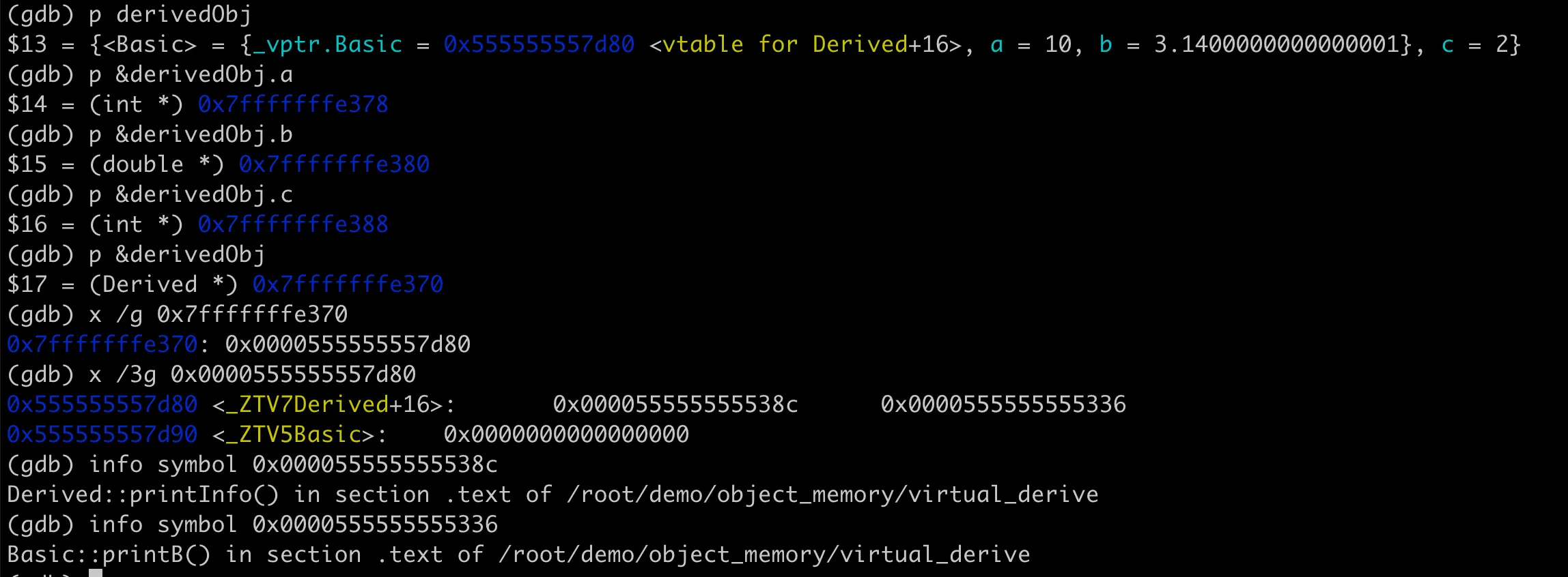 After compiling and running, using GDB to print the memory distribution of member variables, we find that the layout of Derived class objects in memory first includes all member variables of its base class Basic, followed by Derived class’s own member variables. The overall layout is as follows: