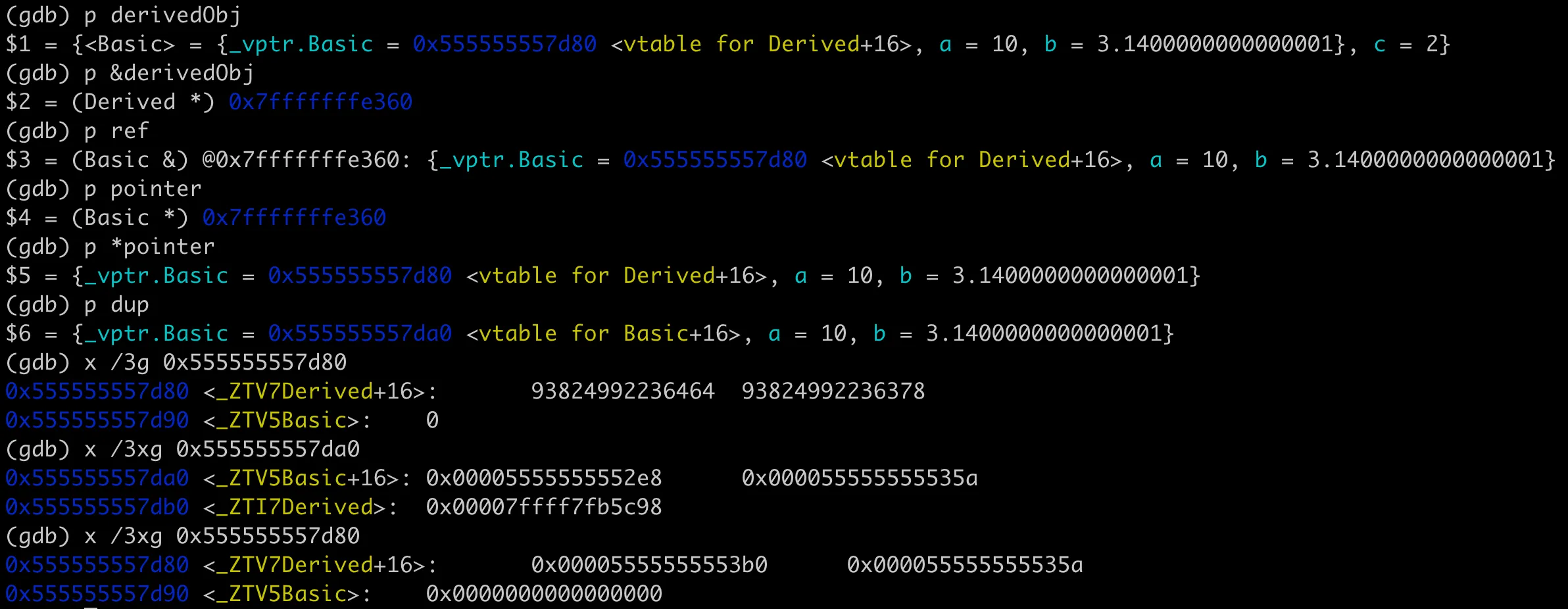 There’s no difference between pointers and references at the compiler’s underlying level. The addresses of ref and ptr are the same, which is the address of the original derived class derivedObj 0x7fffffffe360. The virtual function table pointer inside points to the derived class’s virtual function table, so it can call the derived class’s printInfo. The dup here is generated through the copy constructor, where the compiler performed an implicit type conversion, truncating the base class part from the derived class to generate a base class object. The virtual function table pointer in dup points to the base class’s virtual function table, so it calls the base class’s printInfo.
