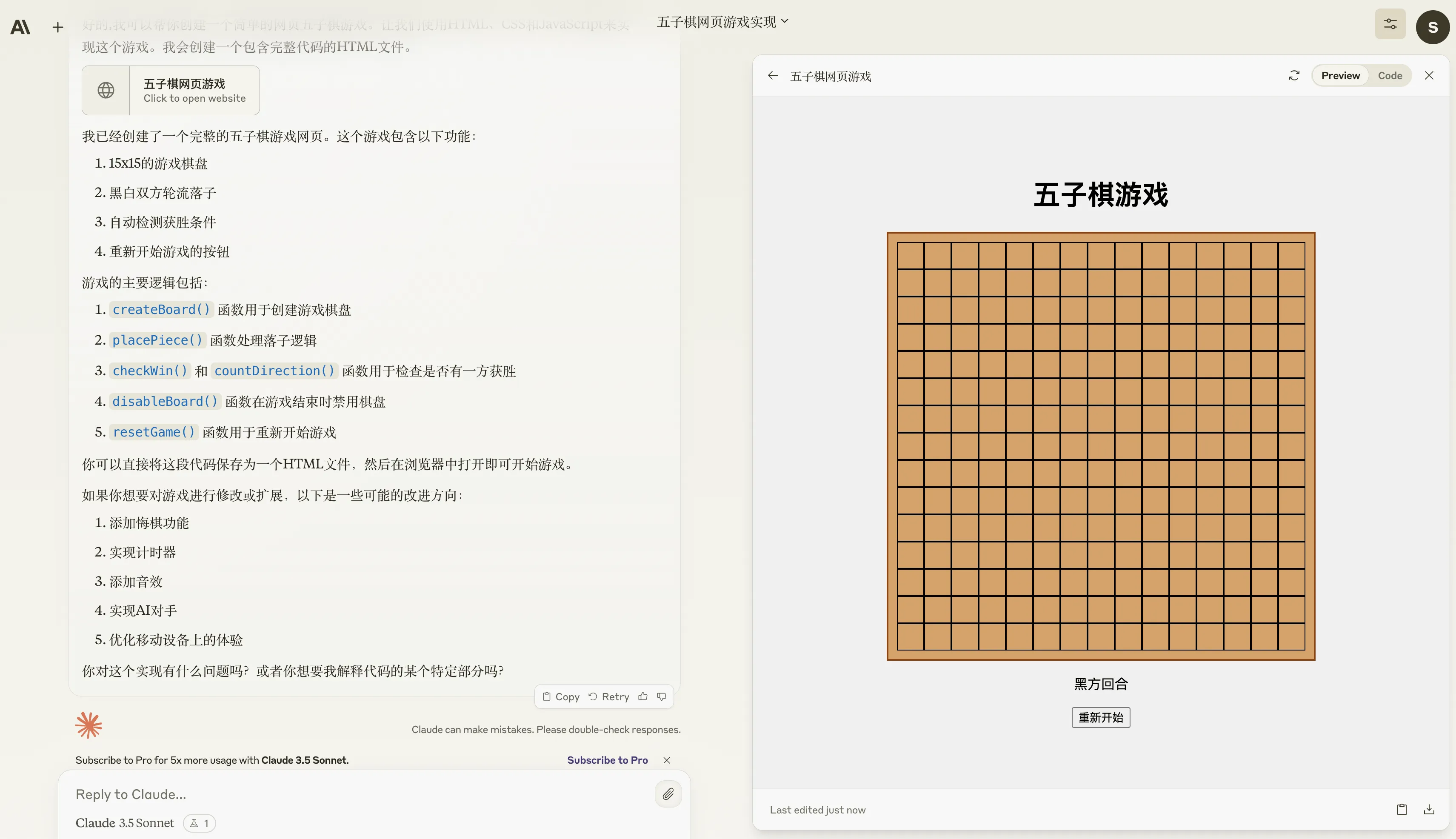 After the code was generated, it directly jumped to a preview page where I could see the Gomoku interface. I originally thought this preview page was static, but surprisingly, I could interact on this page. Clicking on positions on the board would alternately place black and white pieces.
