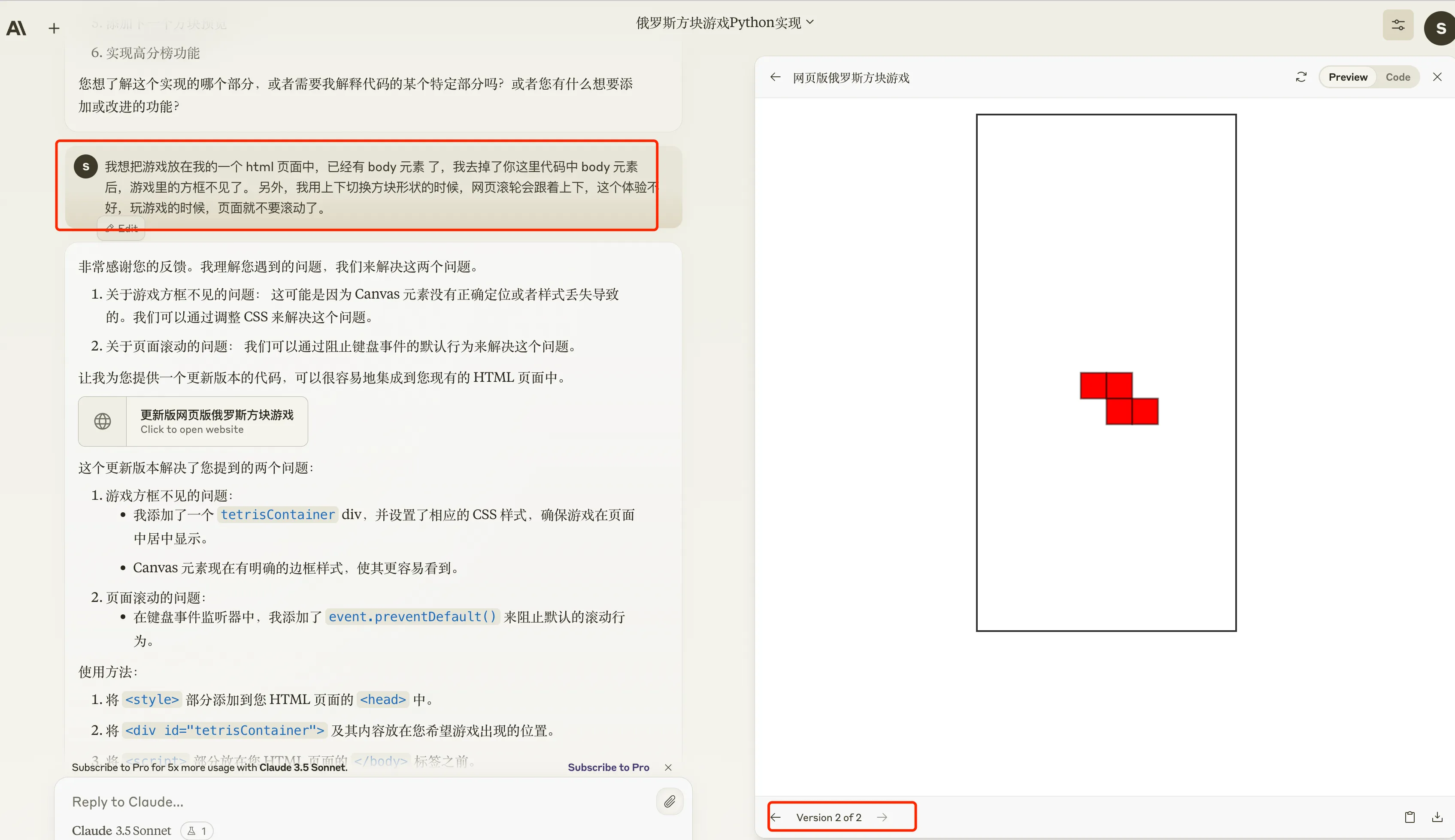 As you can see from the image below, after re-prompting, Claude provided a second version of the file, and then the preview page was a complete Tetris game, controllable by keyboard to move and rotate blocks.