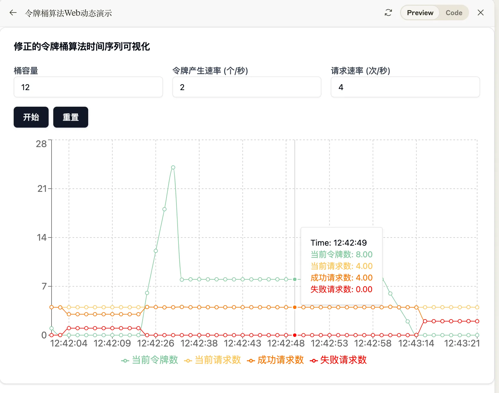 From the simple games written above, Anthropic’s performance is quite impressive. In fact, I also tried to use it to do some algorithm Web visualizations, and Claude3.5 provided very good examples. For instance, I asked it to implement a token bucket rate limiting algorithm, where you can set the token bucket capacity and rate, as well as the token consumption speed, and then have it draw a request monitoring curve.