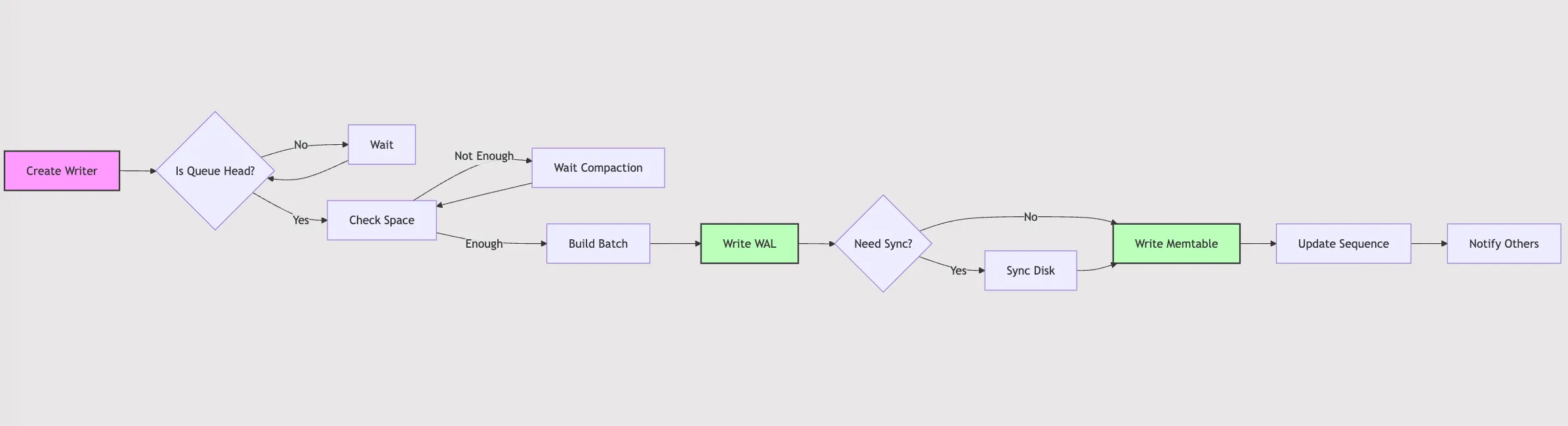 To improve write concurrency performance, each write not only needs to write the front task but also attempts to merge subsequent write tasks in the queue. The merging logic is placed in BuildBatchGroup, which mainly traverses the entire write queue, continuously merging subsequent write tasks into the front write task while controlling the overall batch size and ensuring the disk flush level. The overall constructed write batch is placed in a temporary object tmp_batch_, which is cleared after the complete write operation is finished.
