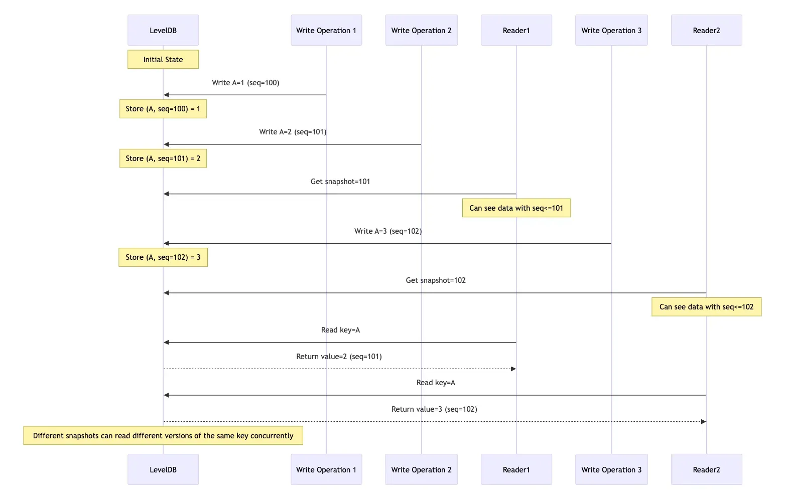 Regardless of whether Reader1 or Reader2 reads first, Reader1 reading key=A will always get value=2 (sequence=101), while Reader2 reading key=A will get value=3 (sequence=102). If there are subsequent reads without specifying a snapshot, they will get the latest data. The sequence diagram below makes this easier to understand; the mermaid source code is here: