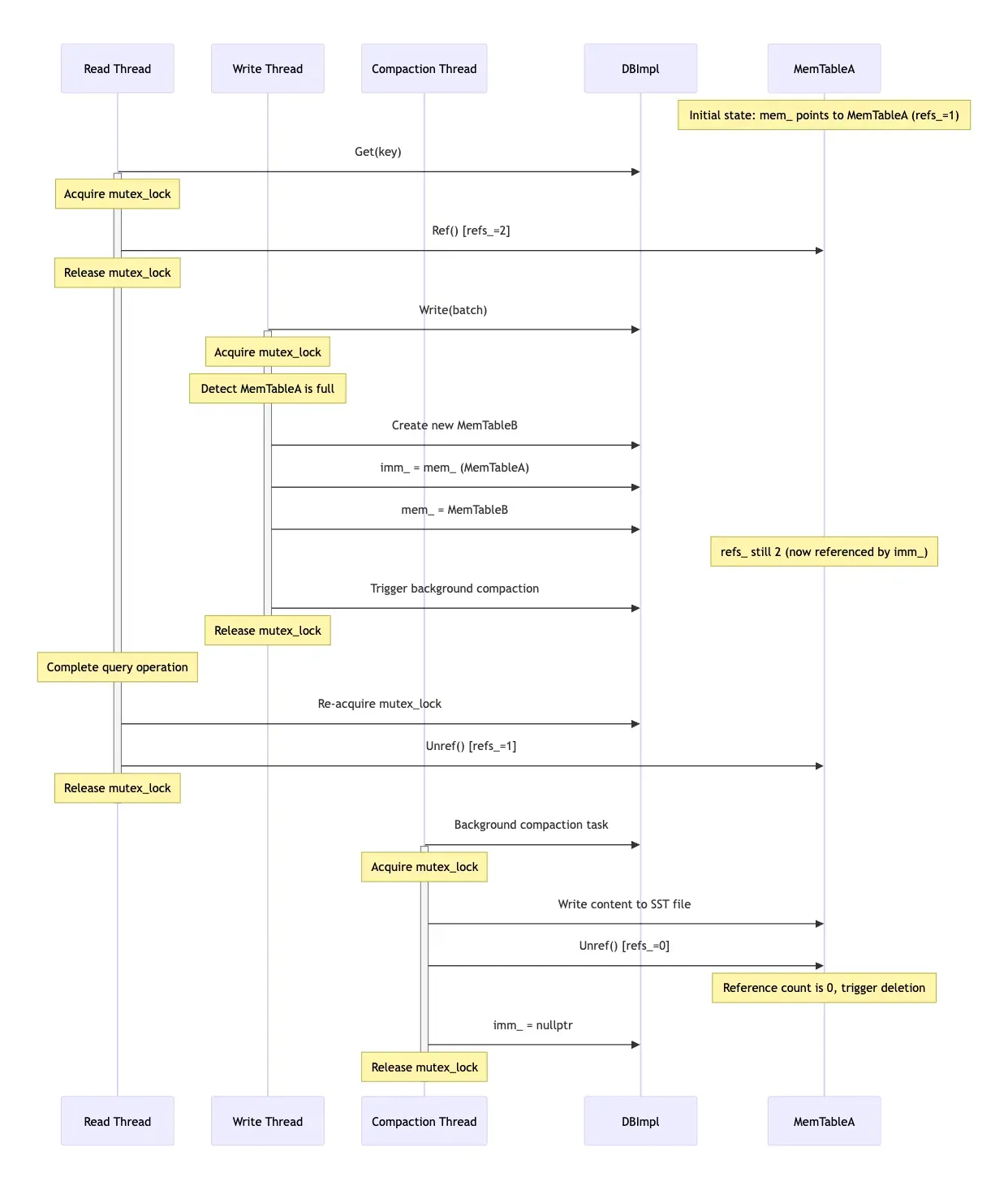 Consider multiple read threads reading mem_ while one write thread is writing to mem_. Each read thread will first get its own reference to mem_, then release the lock and start the find operation. The write thread can continue to write content to it, or create a new mem_ after it is full. As long as any read thread is still searching, the reference count of the original mem_ will not be zero, and the memory address will remain valid. Only after all read threads have finished, and the write thread has filled mem_, converted it to imm_, and written it to an SST file, will the reference count of the original mem_ become zero. At this point, the destruction operation is triggered, and the address can be reclaimed.