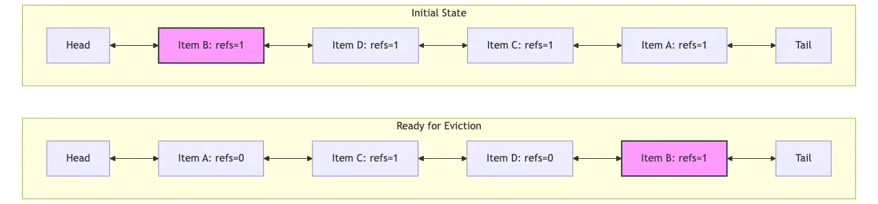 We access items A, C, and D in order, and finally access B. Item B is referenced by a client (refs > 1) and is at the head of the list, as shown in the initial state in the diagram below. Over time, A, C, and D are accessed, but B is not. According to the LRU rule, A, C, and D are moved to the head. Although B is still referenced, its relative position moves towards the tail because it hasn’t been accessed for a long time. After A and D are accessed and quickly released, they have no external references. When eviction is needed, we start from the tail and find that item B (refs > 1) cannot be evicted. We would have to skip it and continue traversing the list to find an evictable item.