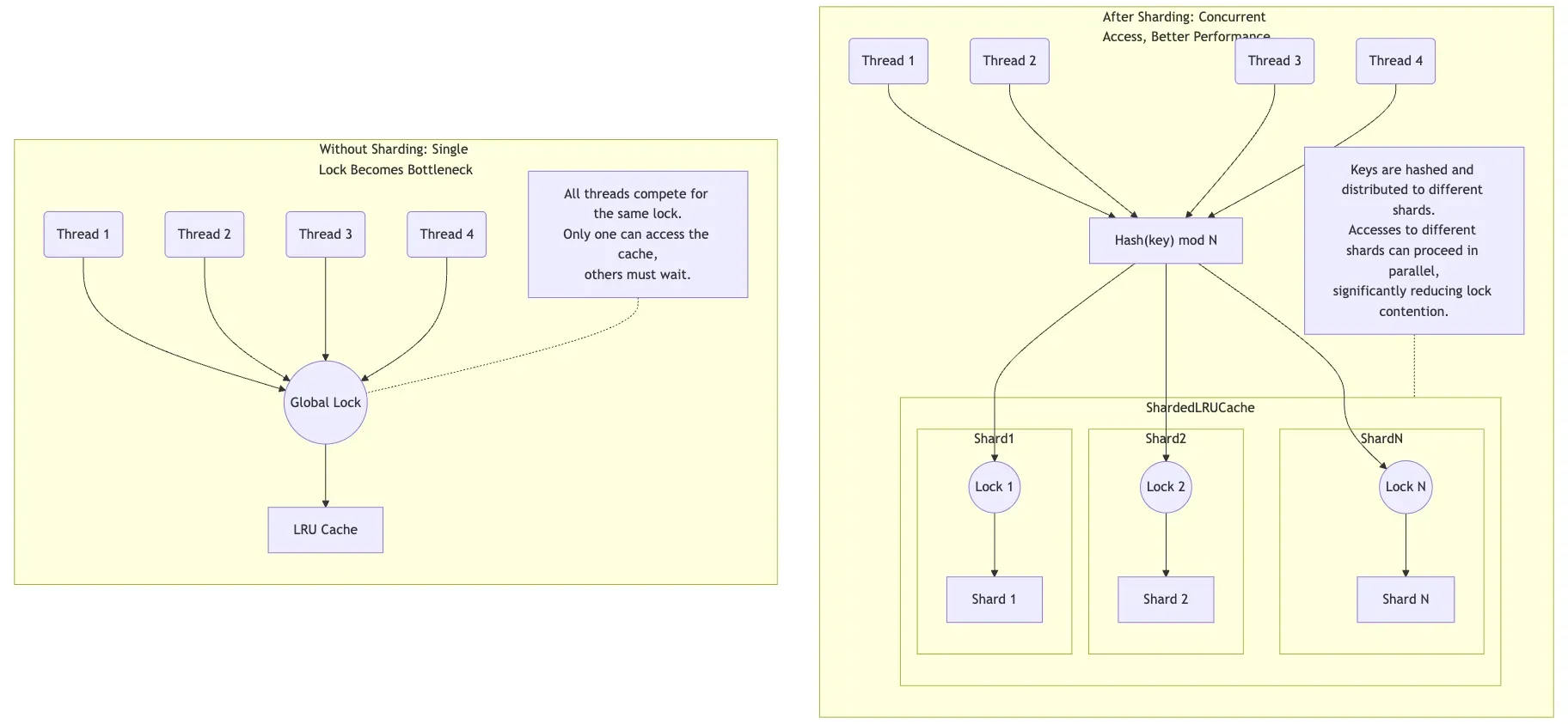 - Sharding to Reduce Lock Contention: ShardedLRUCache divides the cache into multiple shards, each with its own lock, significantly improving concurrency performance in multi-threaded environments.