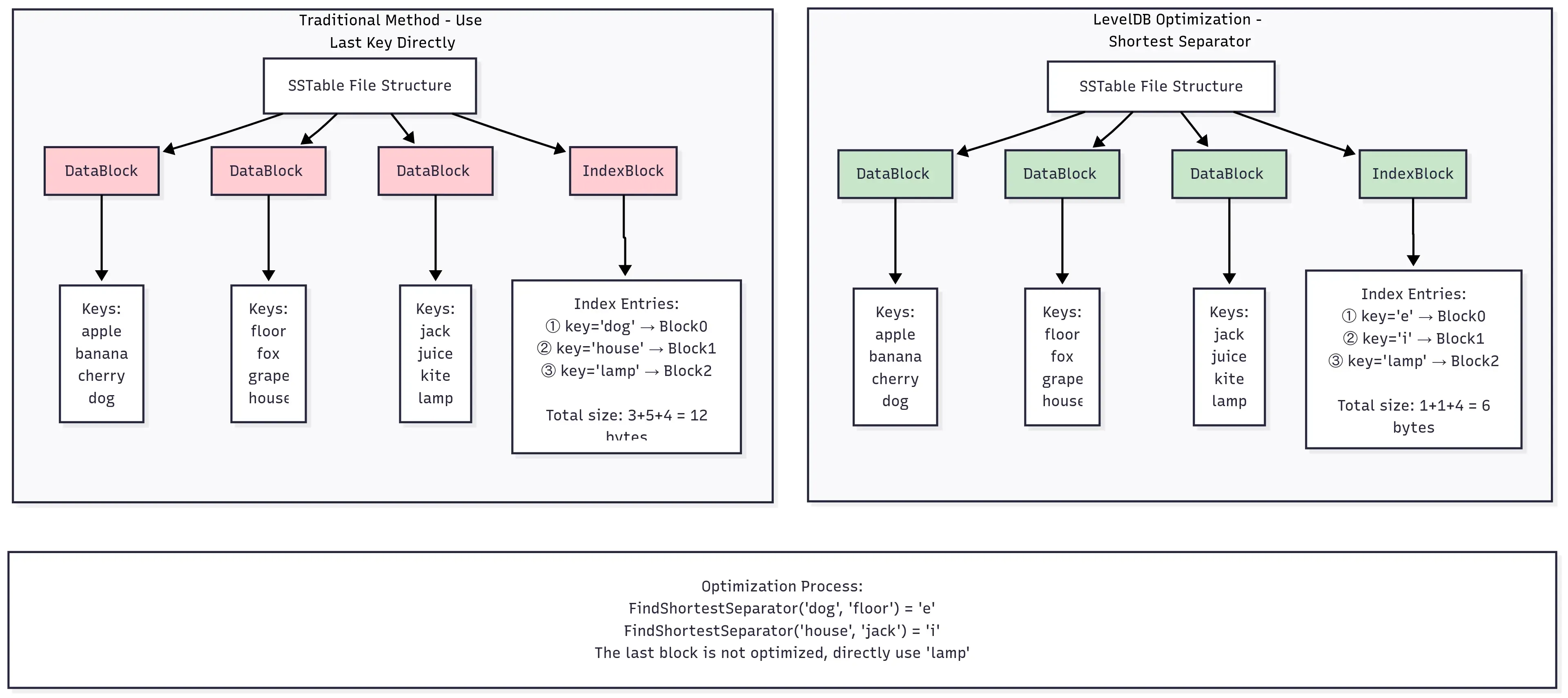 If we think about it, we don’t actually need a real key as the separating index key; we just need a “separator” that can separate the two blocks. This key only needs to satisfy last_key_N <= separator_key < first_key_N+1. LevelDB does just that. It calls options.comparator->FindShortestSeparator to find the shortest separator string between the last key of the previous block and the first key of the next block. The default implementation of FindShortestSeparator is in util/comparator.cc, which I won’t list here.