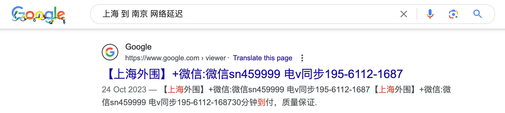 最近在使用 Google 搜索的时候,发现在第一页的搜索结果里,竟然出现了黑产的引流内容。我的搜索关键词”上海到南京网络延迟”,结果第一页出现了外围的引流贴,如下图所示: